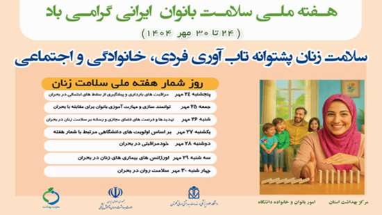 هفته ملی سلامت بانوان ایرانی با شعار «سلامت زنان پشتوانه تاب آوری فردی، خانوادگی و اجتماعی از ۲۴ الی ۳۰ مهرماه ۱۴۰۴ گرامی باد.